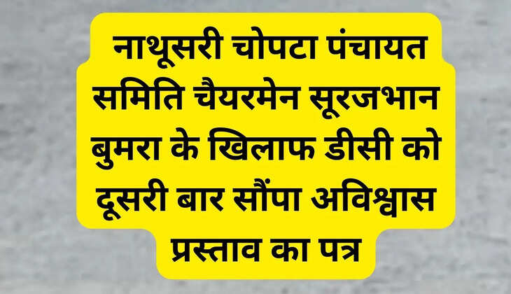 नाथुसरी चौपटा पंचायत समिति के सदस्यों ने पंचायत समिति चैयरमेन के सूरजभान बुमरा के खिलाफ सिरसा जिला उपायुक्त को अविश्वास प्रस्ताव सौंप दिया है। अध्यक्ष सूरजभान ने इस बार विधानसभा चुनाव में बीजेपी छोड़ कर इनेलो ज्वाइन की थी। हालांकि अविश्वास प्रस्ताव में सूरजभान के खिलाफ सदस्यों ने जिला उपायुक्त को सौंपे प्रस्ताव में लिखा है कि सूरजभान चैयरमैन ब्लाक समिति, नाथूसरी चोपटा की कार्यशेली से संतुष्ट नहीं है, इस कारण हम उसके खिलाफ अविश्वाश प्रस्ताव पारित करना चाहते है, आप कृपया करके नियनानुसार कार्यवाही करते हुए सूरजभान चैयरमैन के खिलाफ अविश्वाश प्रस्ताव पास करने की कार्यवाही करने का कष्ट करे । 30 सदस्यों वाली नाथूसरी चौपटा पंचायत समिति के 21 सदस्यों के हस्ताक्षर युक्त अविश्वास प्रस्ताव जिला उपायुक्त को सौंपा गया है।