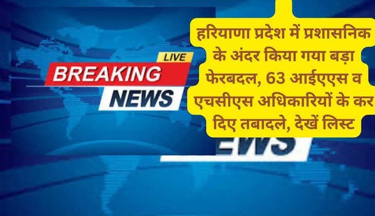 हरियाणा प्रदेश में प्रशासनिक के अंदर किया गया बड़ा फेरबदल, 63 आईएएस व एचसीएस अधिकारियों के कर दिए तबादले, देखें लिस्ट