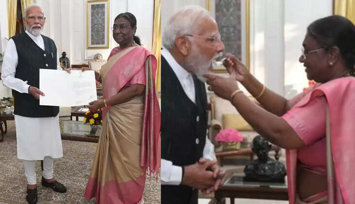 भारतीय जनता पार्टी के दिग्गज नेता नरेंद्र मोदी लगातार तीसरी बार भारत के प्रधानमंत्री पद की शपथ लेने जा रहे हैं। पीएम ने नई सरकार के गठन पर चर्चा करने के लिए राष्ट्रपति द्रोपदी मुर्मू से मुलाकात की। इस दौरान राष्ट्रपति नरेंद्र मोदी से आग्रह करते हुए लेटर सौंपा। जिसमें लिखा था कि मंत्रिपरिषद में शामिल किए जाने वाले लोगों के नामों के बारे में सलाह दी जाए, इसी के साथ ही लिखा था कि राष्ट्रपति भवन में आयोजित होने वाले शपथ ग्रहण समारोह के लिए तारीख और समय के बारे में बताएं।