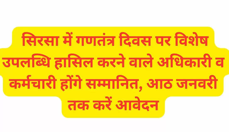 सिरसा में गणतंत्र दिवस पर विशेष उपलब्धि हासिल करने वाले अधिकारी व कर्मचारी होंगे सम्मानित, आठ जनवरी तक करें आवेदन
