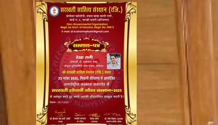 सिरसा। साहित्य, समाज और मानवाधिकारों के क्षेत्र में उल्लेखनीय योगदान के लिए डा. अम्बेडकर चेयर, पंजाब की शोधार्थी व सिरसा निवासी डा. रेखा रानी को सरस्वती साहित्य संस्थान (रजि.) हरियाणा द्वारा प्रतिष्ठित सरस्वती शोधार्थी गौरव सम्मान-2025 प्रदान किया गया। यह सम्मान 23 नवम्बर 2025 को भिवानी (हरियाणा) में आयोजित अंतरराष्ट्रीय सम्मान समारोह में प्रदान किया गया।