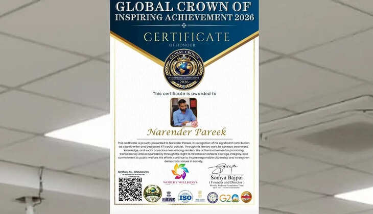“Global Crown of Inspiring Achievement 2026” से अलंकृतसिरसा। हरियाणा के सिरसा जिले के प्रख्यात लेखक, आरटीआई कार्यकर्ता एवं सामाजिक चिंतक नरेंद्र पारीक को वर्ष 2026 के प्रतिष्ठित अंतरराष्ट्रीय सम्मान “Global Crown of Inspiring Achievement” से अलंकृत किया गया है। यह सम्मान उन्हें सामाजिक पारदर्शिता, जन-जागरूकता और लोकतांत्रिक मूल्यों को सशक्त करने में उनके निरंतर एवं प्रभावशाली योगदान के लिए प्रदान किया गया।