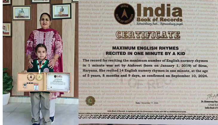 हरियाणा मेें सिरसा की बेटी ने अनोखा कारनामा किया है। यूकेजी कक्षा की 5 वर्षीय होनहार छात्रा ऐशरीत ने एक मिनट में 14 इंग्लिस कविताएं सुनाकर अनूठा रिकार्ड बनाया है। इंडिया बुक ऑफ रिकार्ड ने ऐशरीत की इस उपलब्धि को दर्ज करते हुए अवार्ड जारी किया है।