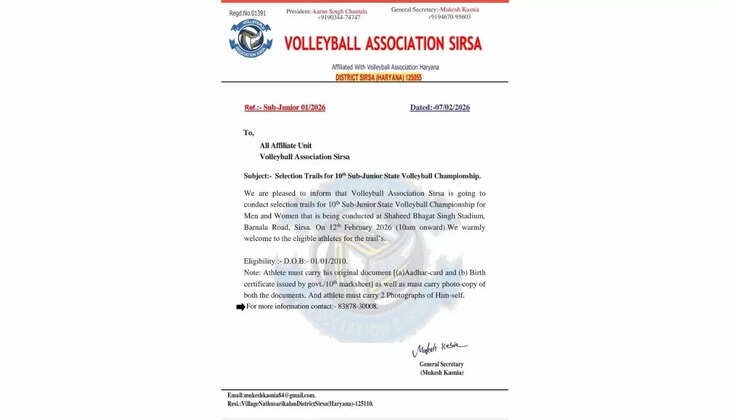वॉलीबॉल एसोसिएशन सिरसा द्वारा 10वीं सब-जूनियर राज्य स्तरीय वॉलीबॉल चैंपियनशिप (पुरुष एवं महिला वर्ग) के लिए चयन ट्रायल का आयोजन किया जा रहा है। यह चयन ट्रायल दिनांक 12 फरवरी 2026 को शहीद भगत सिंह स्टेडियम, बरनाला रोड, सिरसा में सुबह 10 बजे से आयोजित होंगे।
