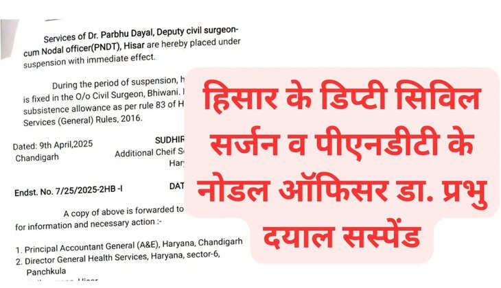 हरियाणा की बड़ी खबरों में हिसार से हैं। हिसार के डिप्टी सिविल सर्जन व पीएनडीटी के नोडल ऑफिसर डा. प्रभु दयाल को सस्पेंड कर दिया गया है।