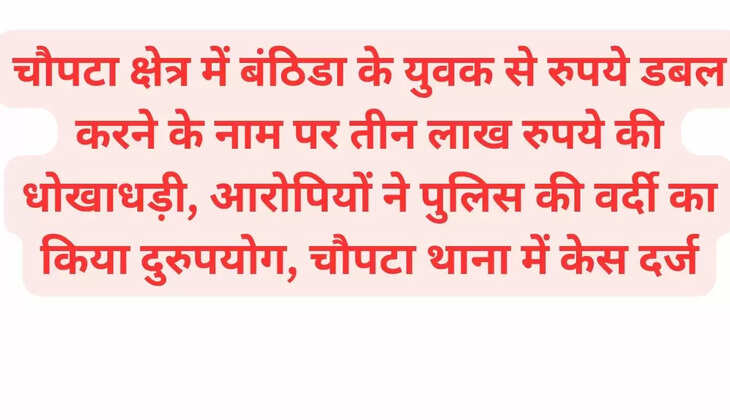 चौपटा क्षेत्र में बंठिडा के युवक से रुपये डबल करने के नाम पर तीन लाख रुपये की धोखाधड़ी, आरोपियों ने पुलिस की वर्दी का किया दुरुपयोग, चौपटा थाना में केस दर्ज