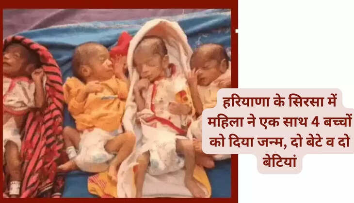 हरियाणा प्रदेश के सिरसा में 24 वर्ष की महिला ने दो बेटे व दो बेटियां को जन्म दिया है। जो सिरसा में ये नहीं पूरे प्रदेश में चर्चा का विषय बना हुआ है। आपको बता दें कि चार बच्चों को एक साथ जन्म देने वाली महिला रज्जो देवी पहली बार मां बनी है। चार बच्चों को जन्म देने वाली महिला व सभी बच्चे पूरी तरह स्वस्थ हैं।