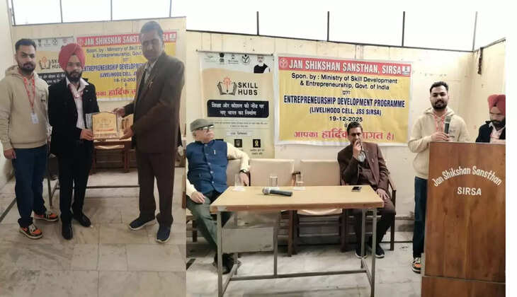 सिरसा जन शिक्षण संस्थान सिरसा कौशल विकास एवं उद्यमशीलता मंत्रालय भारत सरकार द्वारा गत दिवस पूर्व विद्यार्थियों के रोजगार मार्गदर्शन हेतू उद्यमशीलता विकास कार्यक्रम आयोजित किया। संस्थान के निदेशक धर्मपाल गर्ग ने बताया कि इस कार्यक्रम मे यूनियन बैंक के प्रबंधक सुखमीत सिंह ने मुख्य अतिथि के तौर पर तथा पूर्व साक्षरता मिशन अधिकारी भूपेन्द्र देव तथा यूनियन बैंक के सहायक प्रबंधक रोहित कुमार ने विशिष्ट अतिथि के तौर पर शिरकत की।