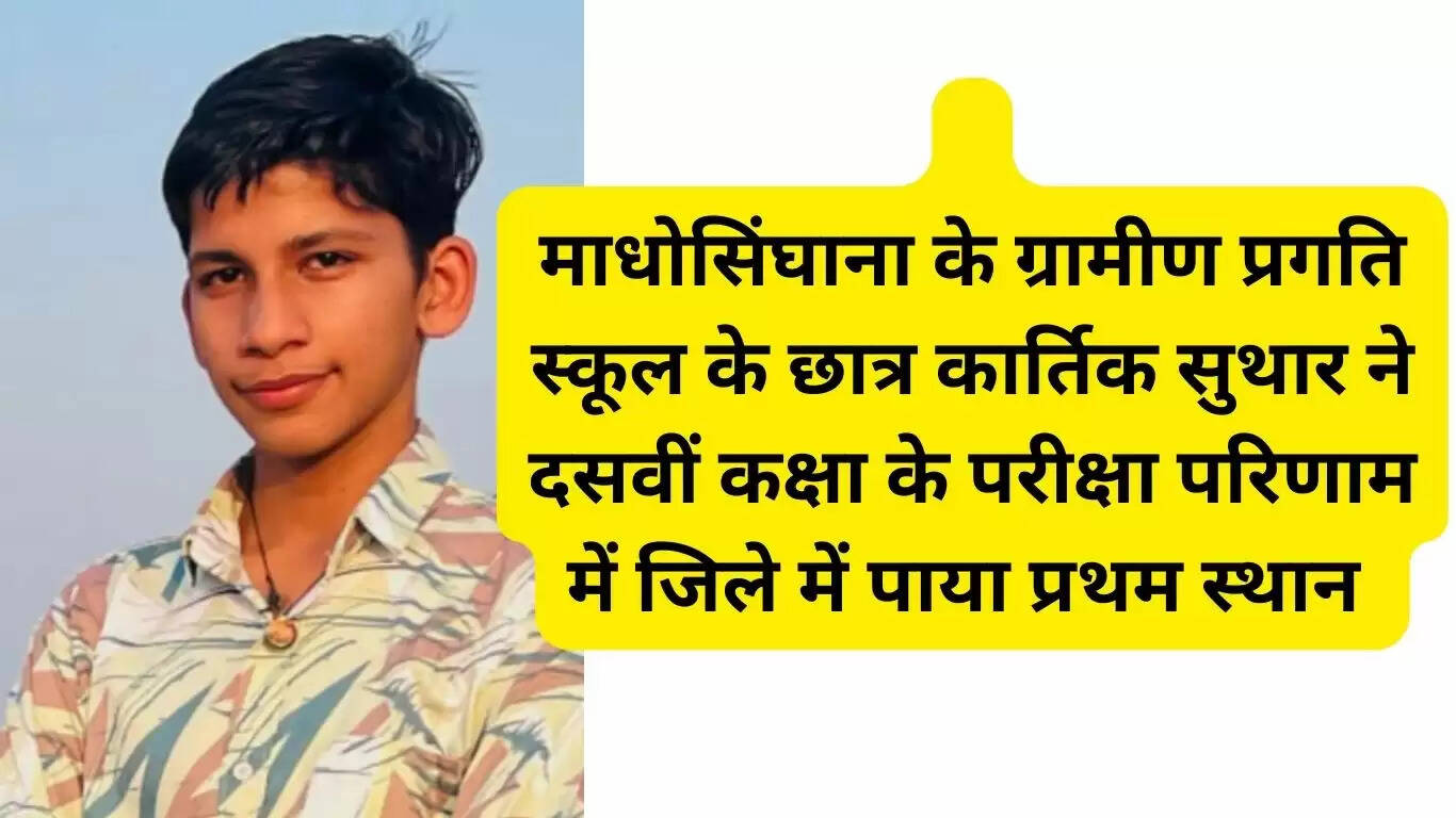 माधोसिंघाना के ग्रामीण प्रगति स्कूल के छात्र कार्तिक सुथार ने दसवीं कक्षा के परीक्षा परिणाम में जिले में पाया प्रथम स्थान