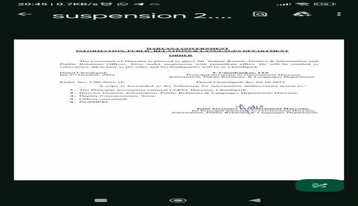 देश के प्रधानमंत्री नरेंद्र मोदी और हरियाणा के मुख्यमंत्री मनोहर लाल के स्वच्छता अभियान की फोटो पर कमेंट लिखना हरियाणा के सिरसा में जिला लोक संपर्क विभाग में कार्यरत क्लर्क को भारी पड़ गया। अब इस मामले में हरियाणा लोक संपर्क विभाग ने भी कड़ा रूख अपना है। अब इस मामले में सिरसा के डीपीआरओ संजय कुमार को सस्पेंड कर दिया गया है। बता दें कि डीपीआर सिरसा के ट्वीटर एकाउंट का मिसयूज करने पर लिपिक कर्मचारी के खिलाफ सिविल लाइन थाना सिरसा में आईटी एक्ट के तहत केस दर्ज पहले से ही कर लिया गया है। इसके लिए प्रिंसीपल सेक्ट्ररी हरियाणा सरकार आइएएस वी उमाशंकर ने निर्देश जारी कर दिए हैं।