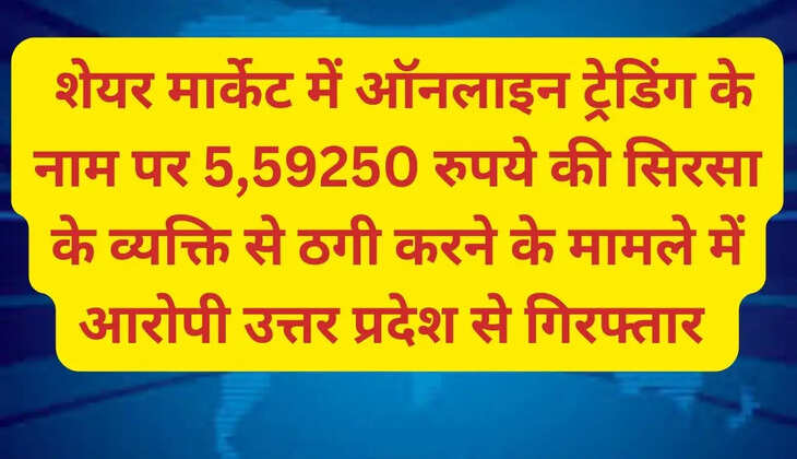 शेयर मार्केट में ऑनलाइन ट्रेडिंग के नाम पर 5,59250 रुपये की सिरसा के व्यक्ति से ठगी करने के मामले में आरोपी उत्तर प्रदेश से गिरफ्तार
