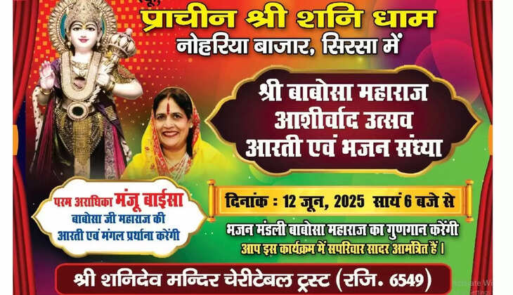 हरियाणा के सिरसा में स्थित नोहरिया बाजार स्थित प्राचीन श्री शनिधाम में 12 जून वीरवार को भगवान बाबो सा महाराज की परम अराधिका मंजू बाई सा पधारेंगी। वीरवार शाम को मंदिर प्रांगण में बाबो सा महाराज का उत्सव, आरती एवं भजन संध्या का कार्यक्रम आयोजित किया जाएगा। इस कार्यक्रम को लेकर तैयारियां की जा रही है।